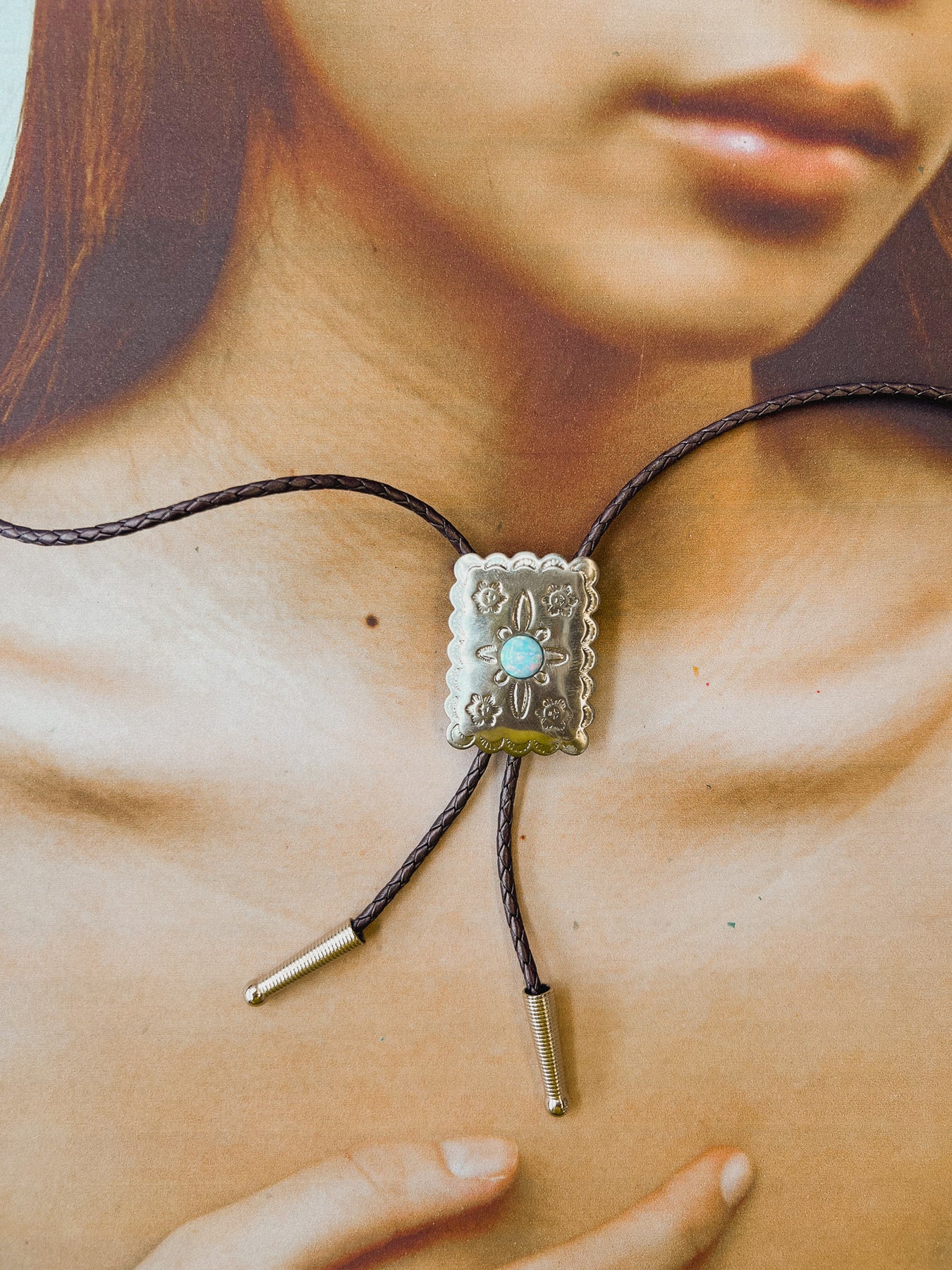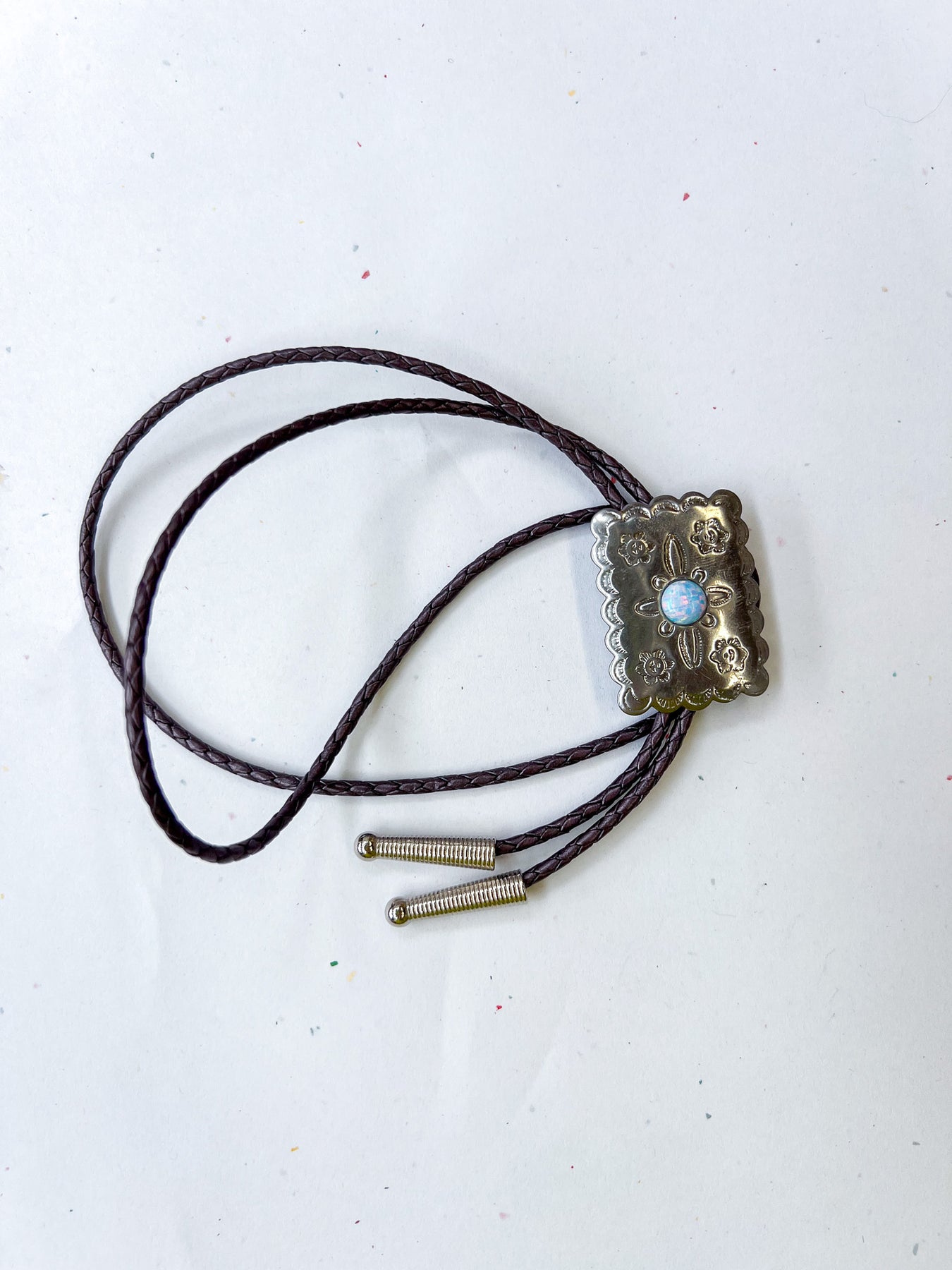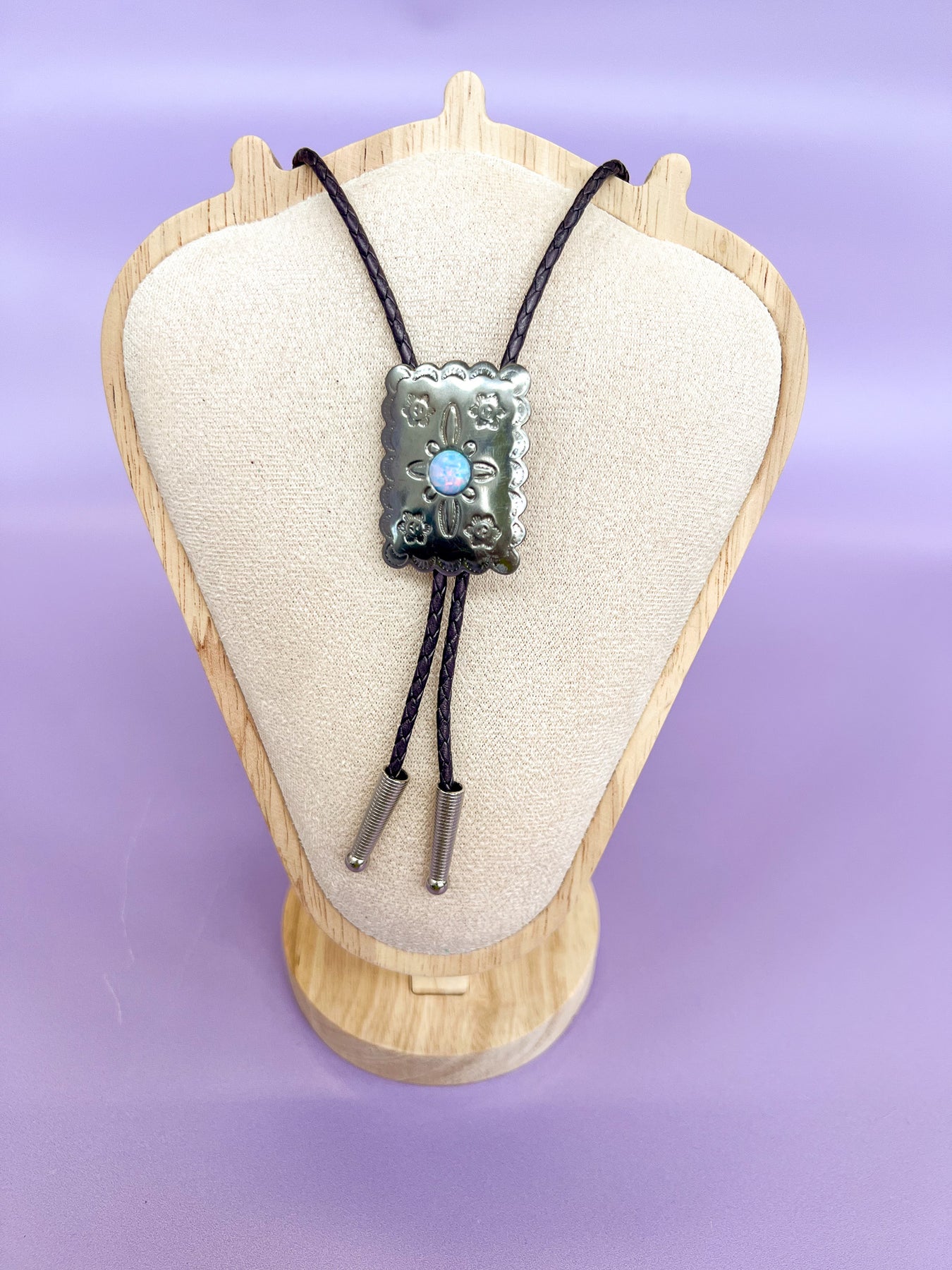 Cornflower Opal Braided Leather Bolo Tie - Handmade Western Neckwear