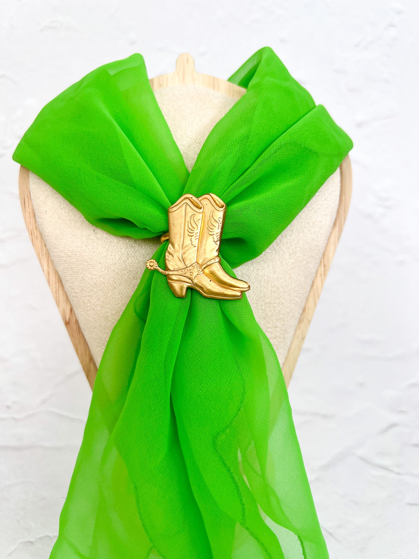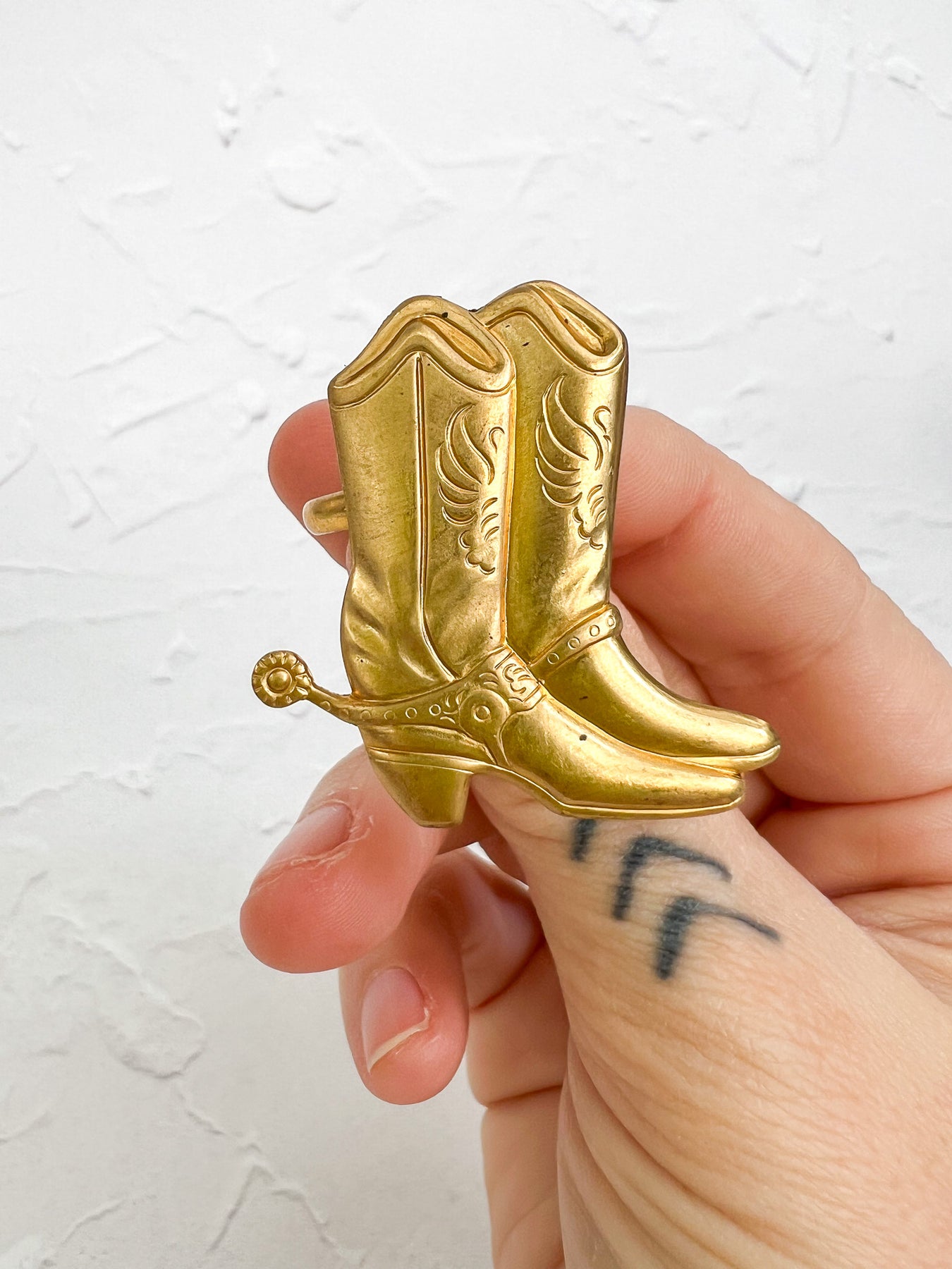 Antique brass boot stamping on a gold plated stainless steel ring slide. This is for the slide only, bandana is not included.