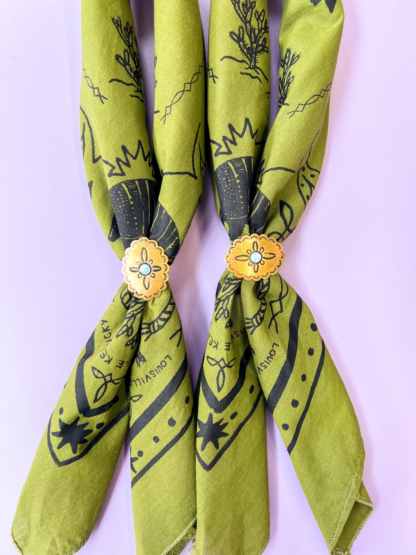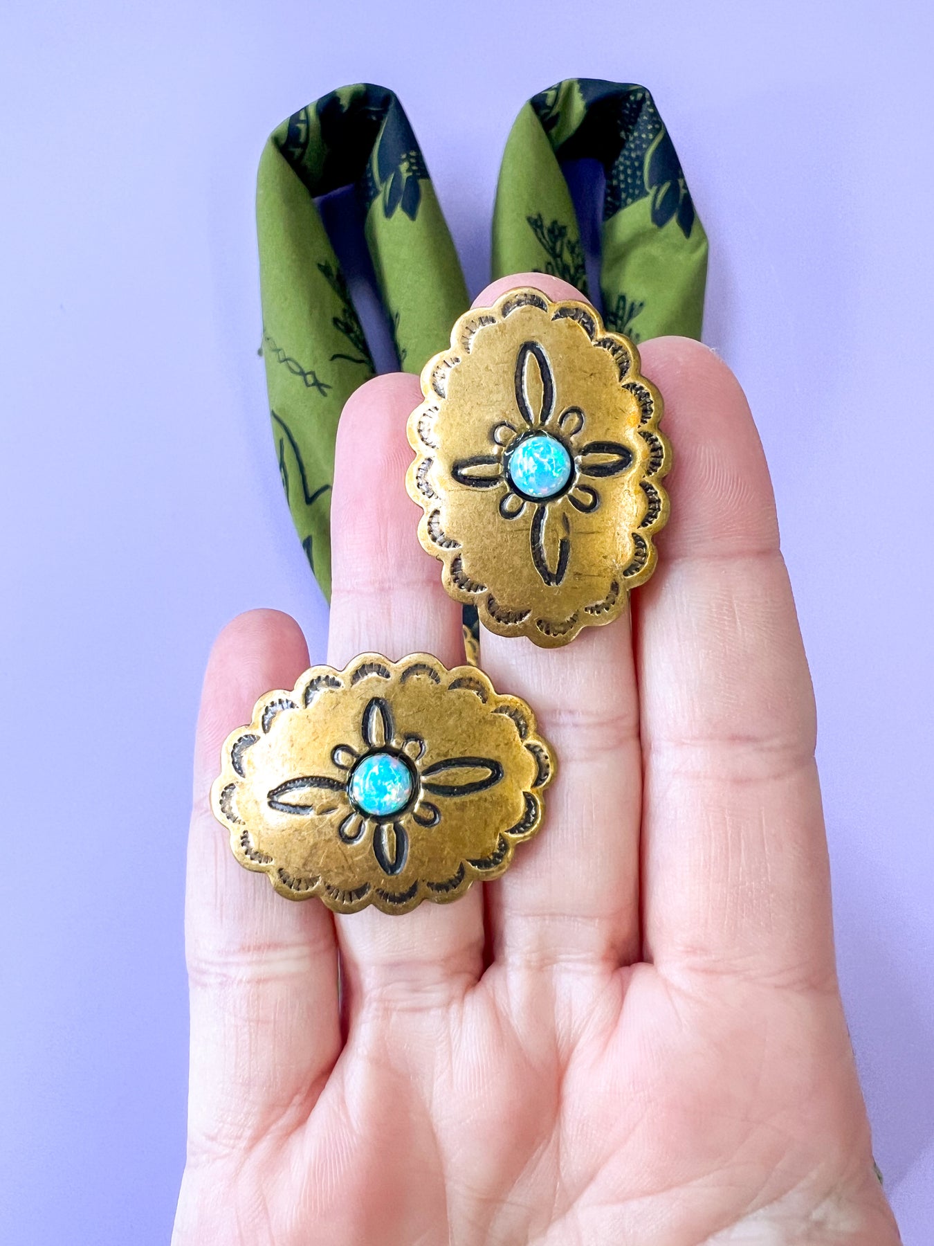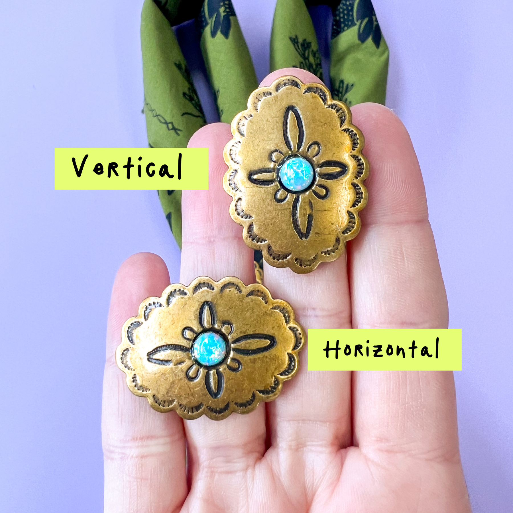 Gold plated stainless steel concho 1.5in oval stamping. This is a lightweight front slide made to look vintage. The back ring is attached with sturdy epoxy. Slide on back is gold plated stainless steel. This is for the slide only, bandana is not included. The opal is certified lab grown.