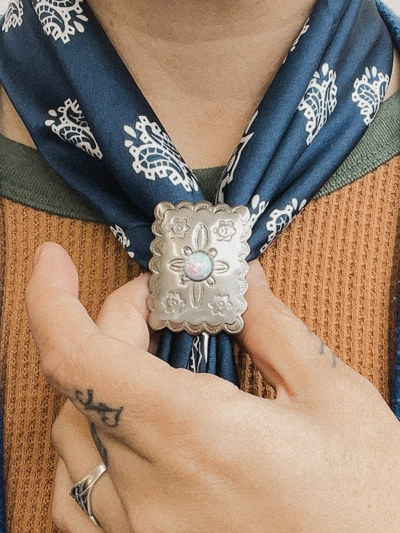 Stainless steel concho 1.5in rectangle stamping with real cornflower opal set in the center. Slide on back is stainless steel. This is for the slide only, bandana is not included.