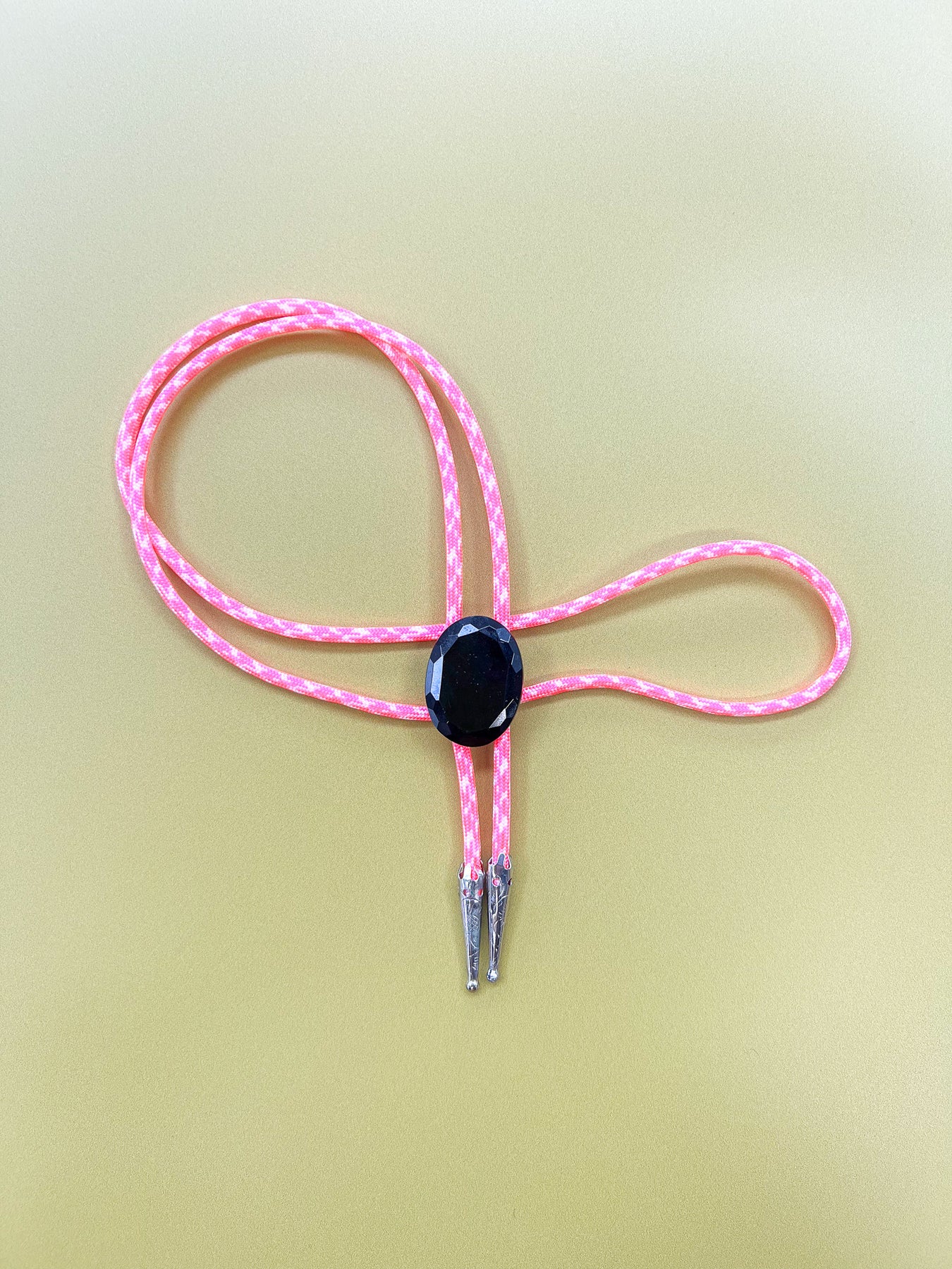 Pink camo paracord with a repurposed costume earring as the bolo slide finished with silver tips. Bolo is 16in long.