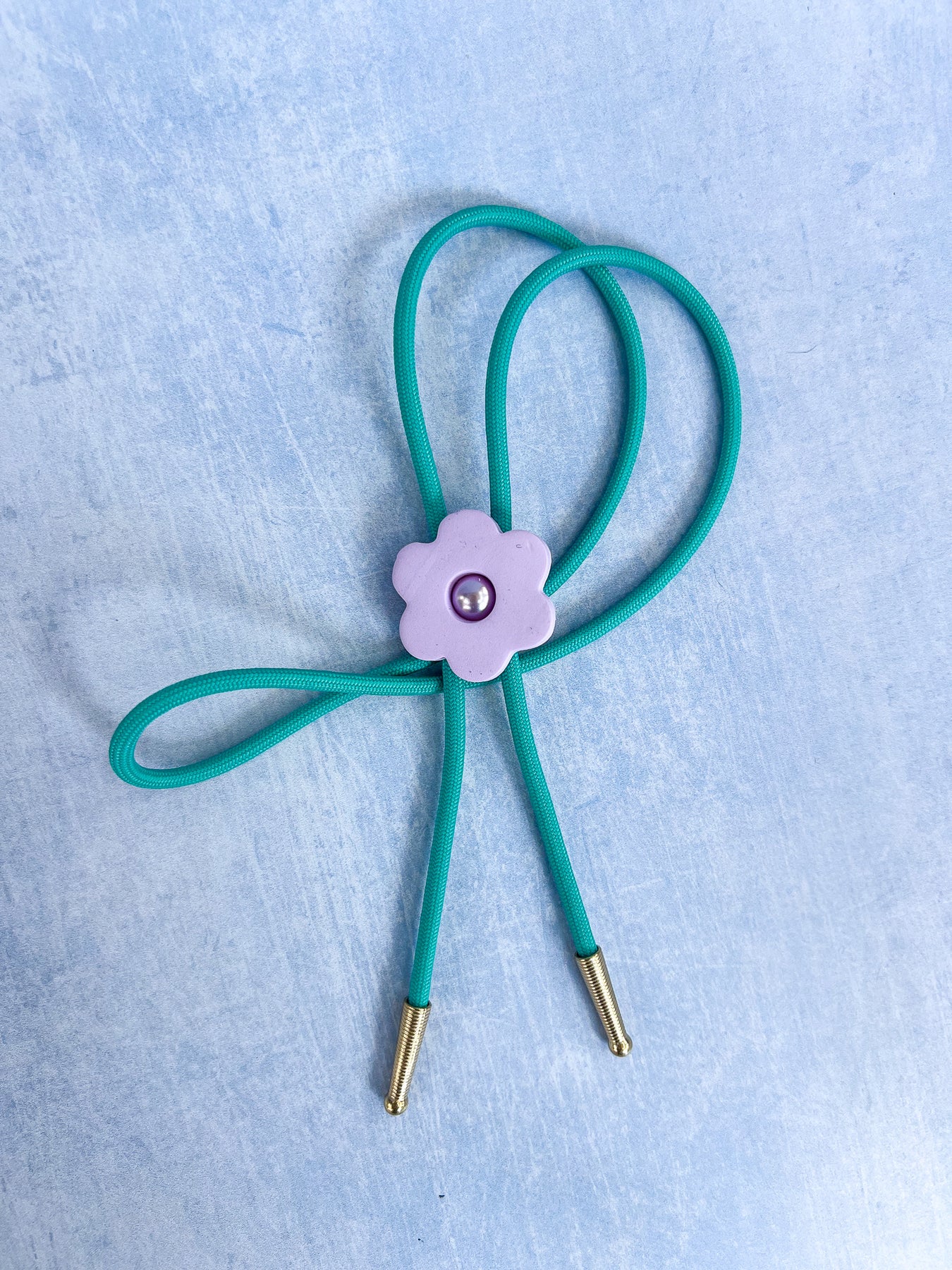 Polymer clay flower shape with gold metal tips on a blue cord. Cord length 30in.