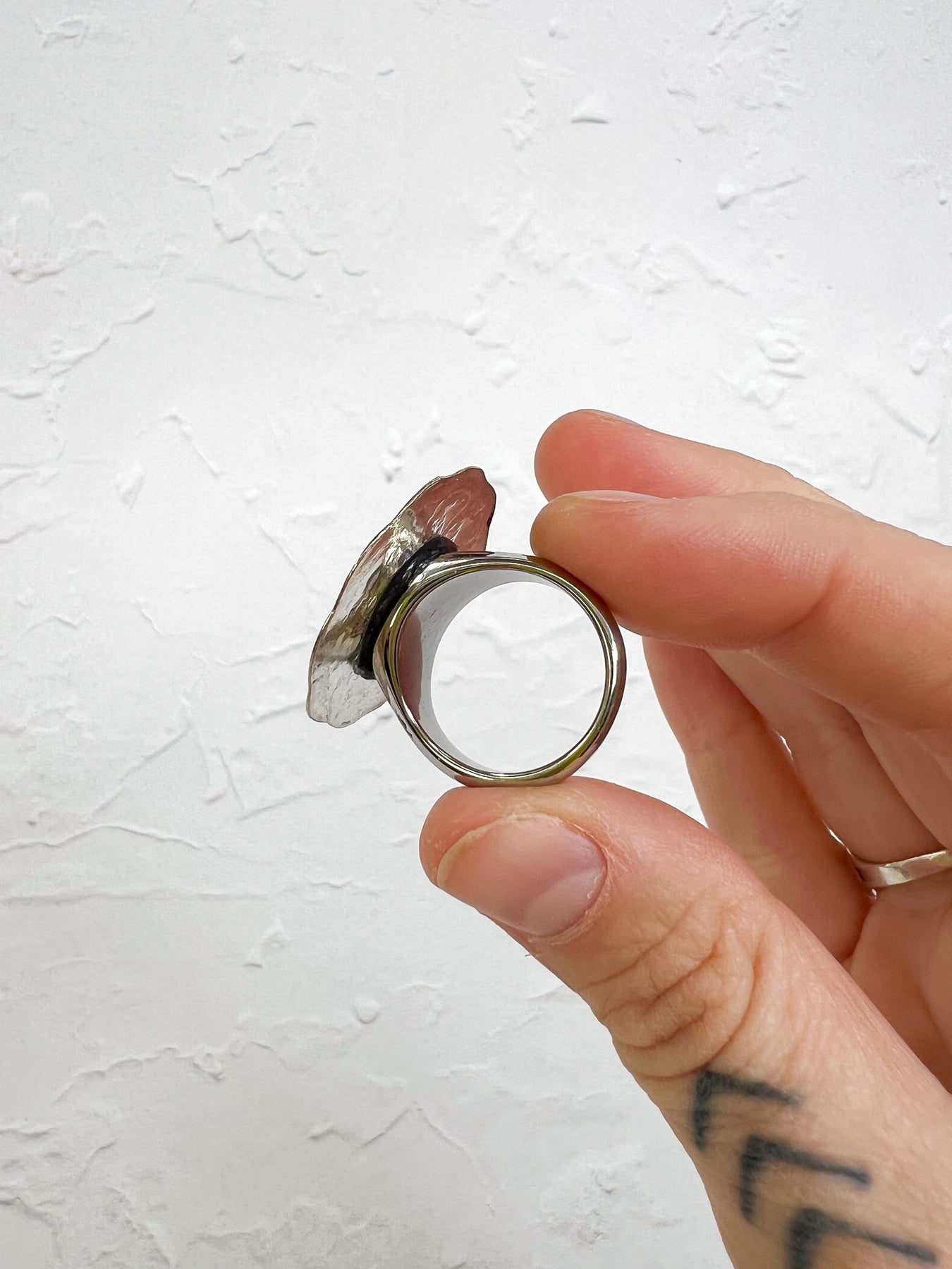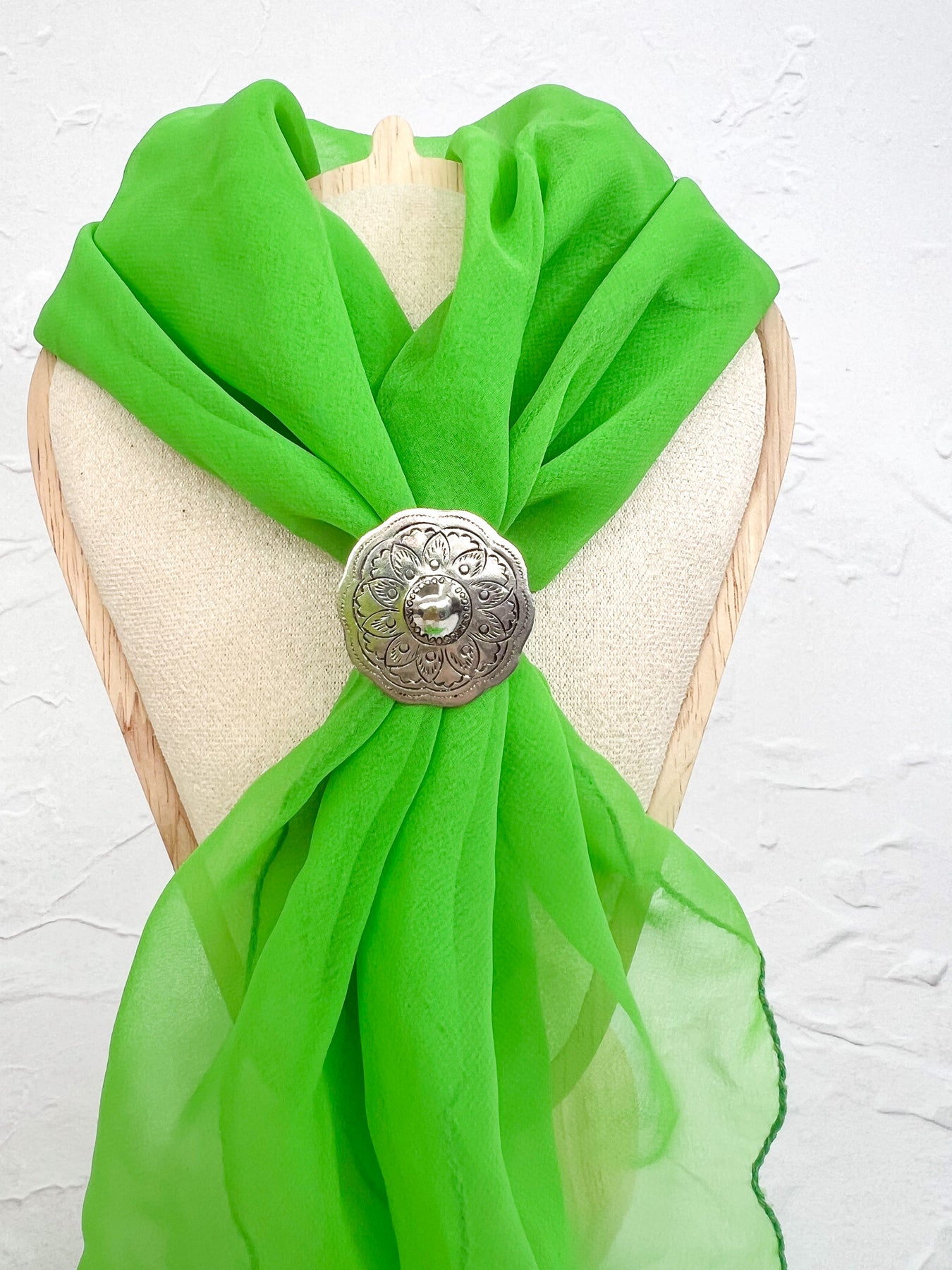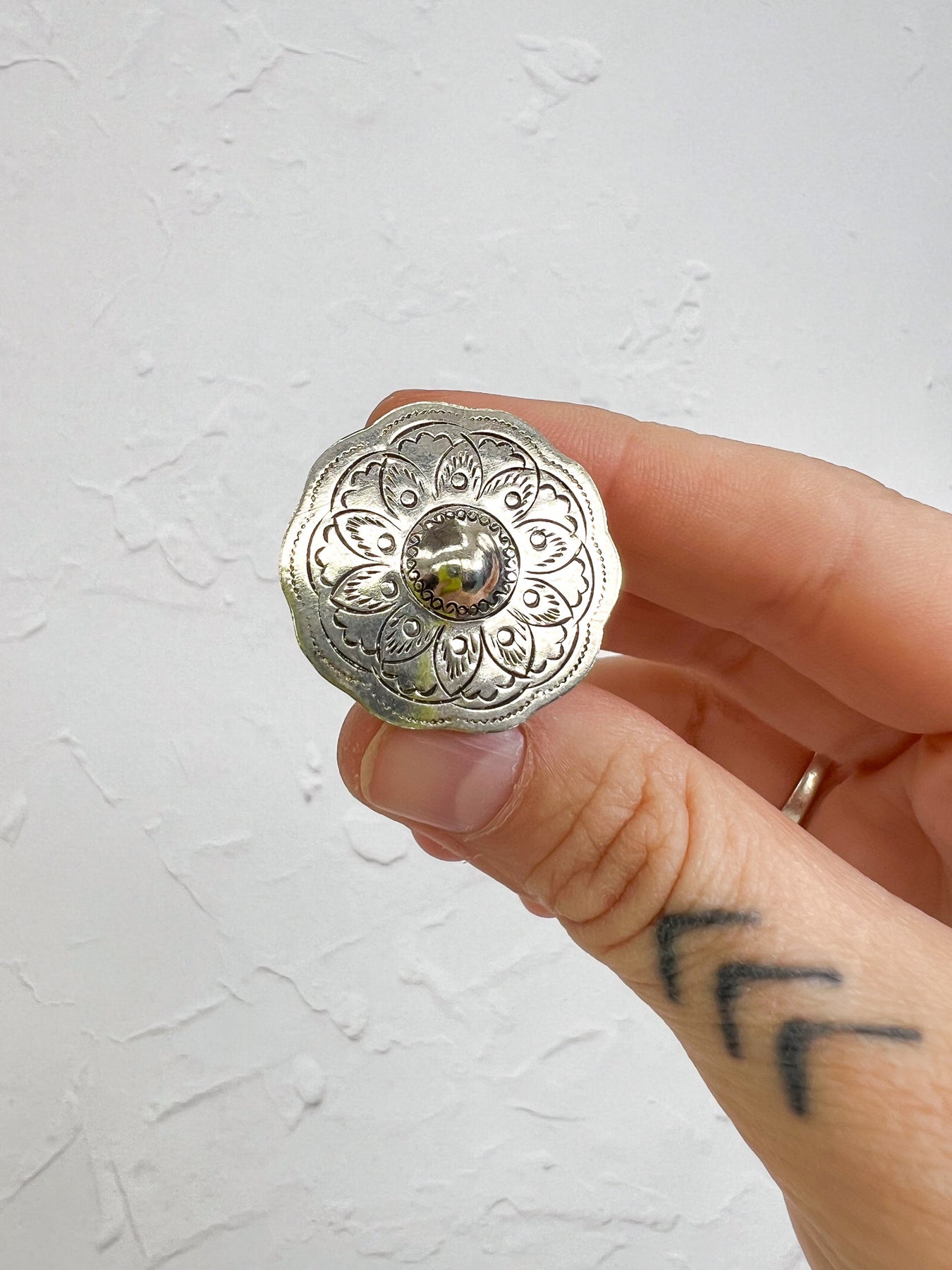 Stainless steel concho 1in round stamping. This is a lightweight front slide. The back ring is attached with sturdy epoxy. Slide on back is stainless steel. This is for the slide only, bandana is not included.