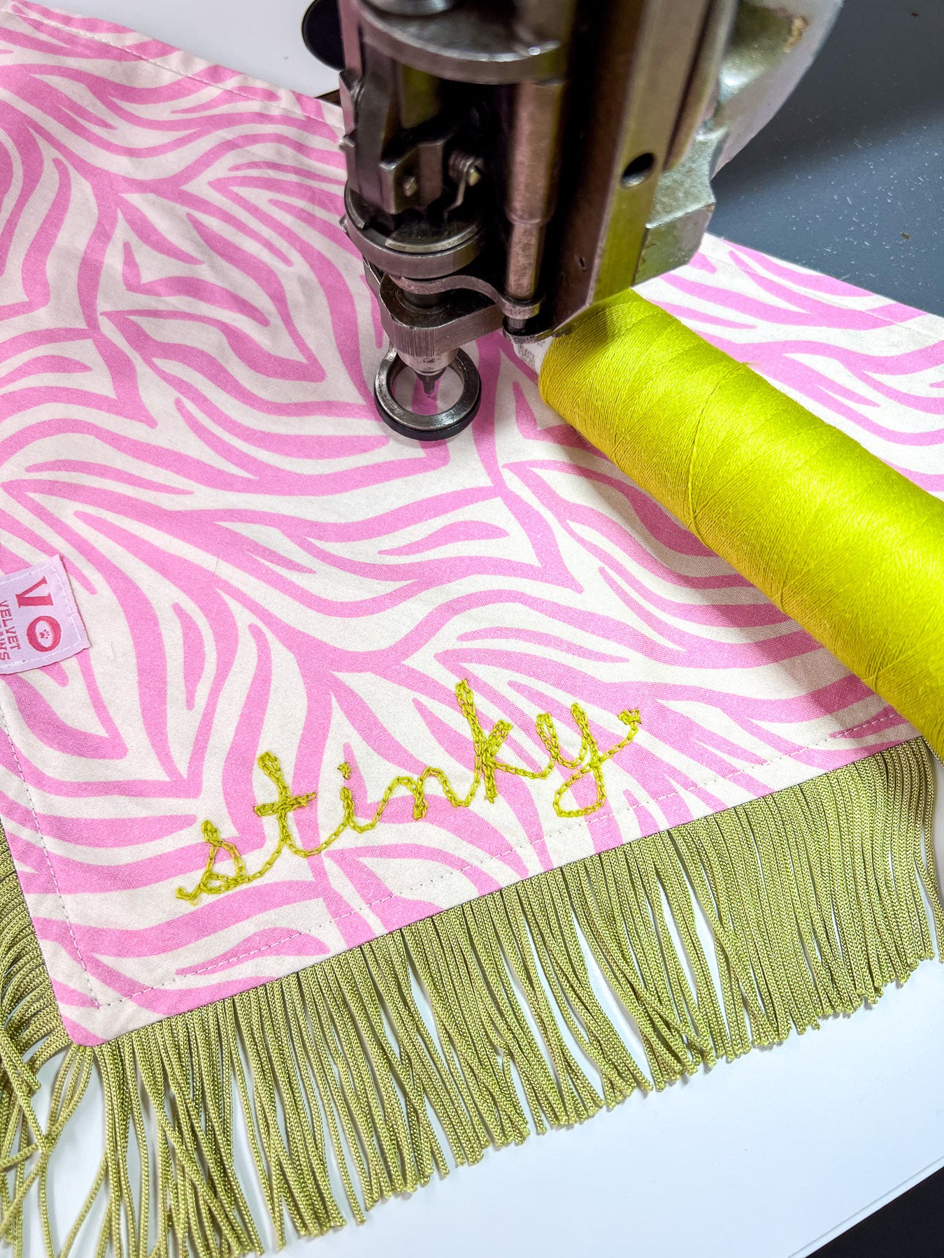 Loud, playful, and unapologetically bold—the Pink Zebra Stripe Fringe Pet Bandana brings maximalist energy to your pet accessory collection. With a hot pink and black zebra stripe print on 100% cotton and a 2-inch coordinating fringe, this handmade piece turns heads while offering comfortable, secure wear. Its triangle shape makes it easy to tie, and the size range ensures a great fit for pups of all personalities. Handmade in Louisville, KY, it’s built for retailers who want to stock statement pieces that sell.