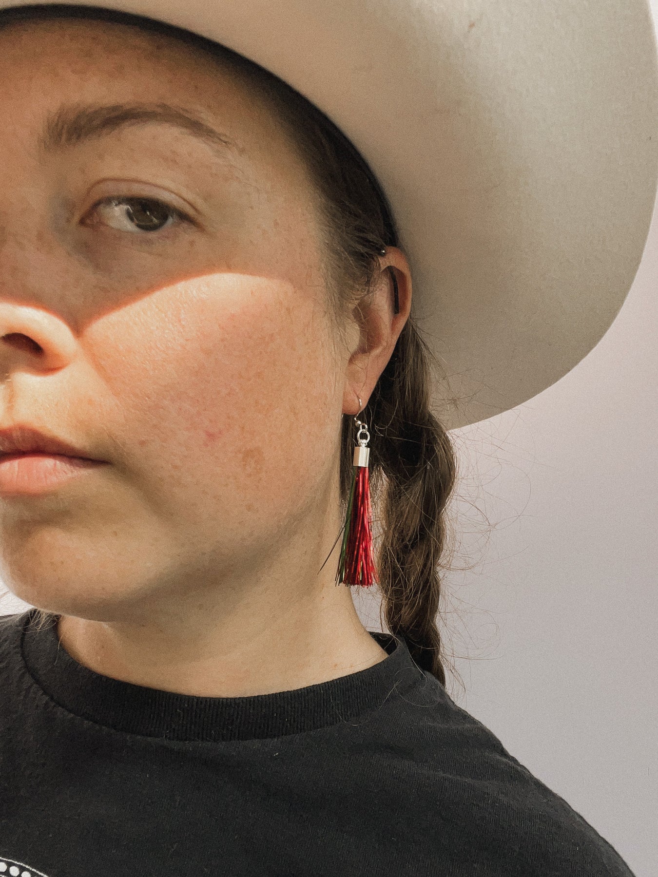 Gift yourself or a friend a unique set of mini red and green metallic tinsel tassel earrings for a special occasion. They feature 18K white gold hooks and tinsel fringe that dangle perfectly from your ears for a spectacular look. Fringe is very soft!