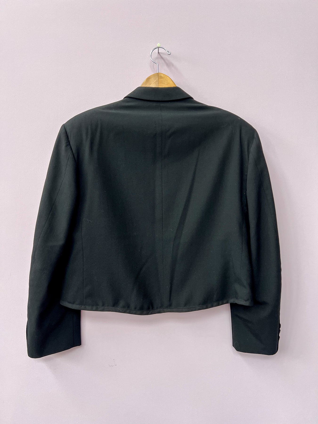 Reworked black tux with added black denim hand cut applique and rhinestones. Jacket has one front button and is slightly cropped.
