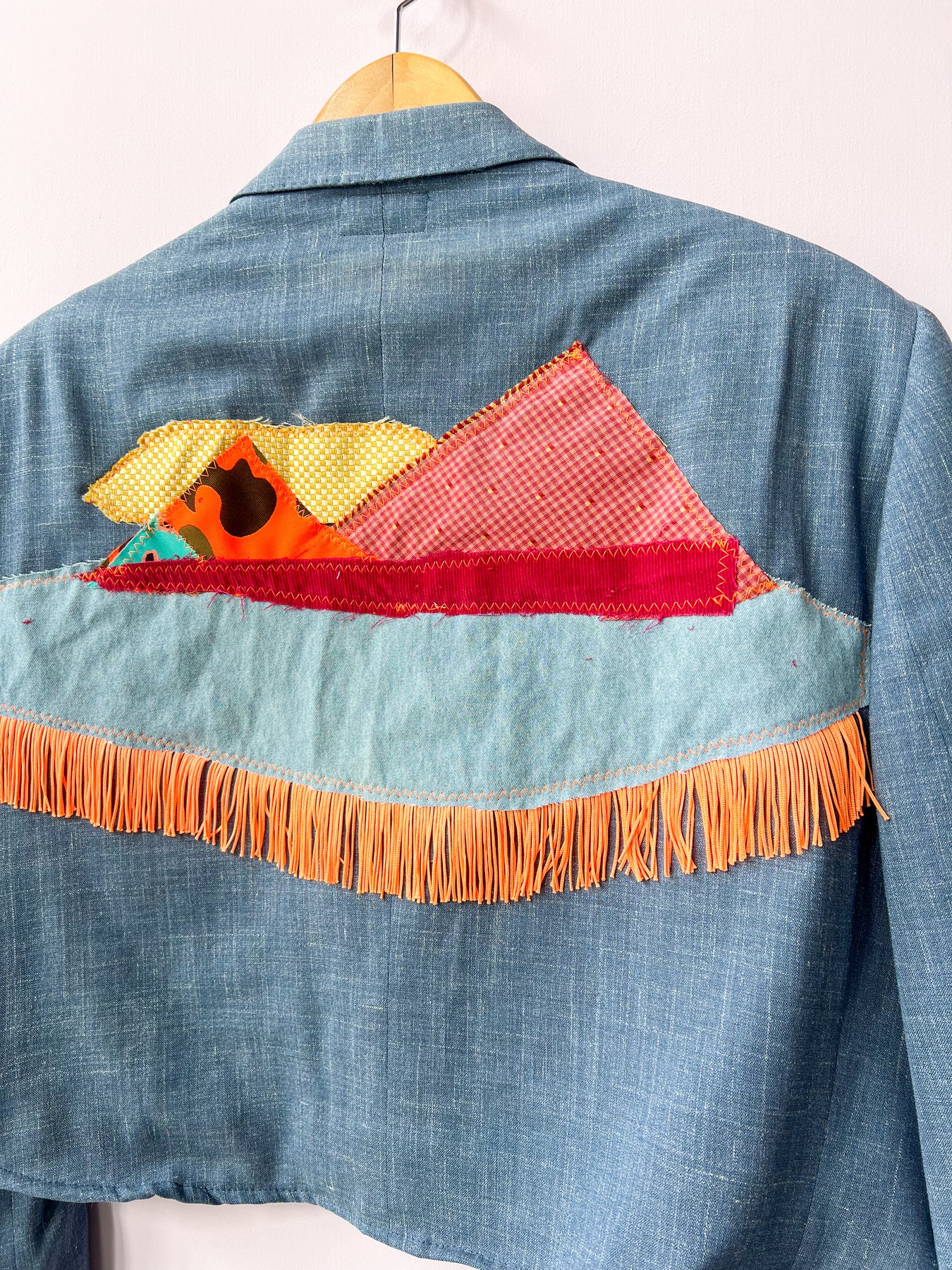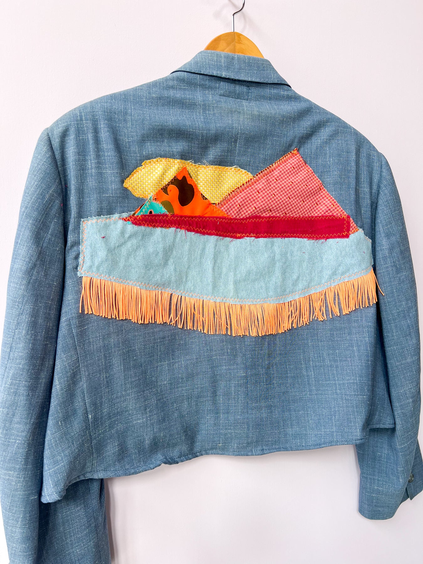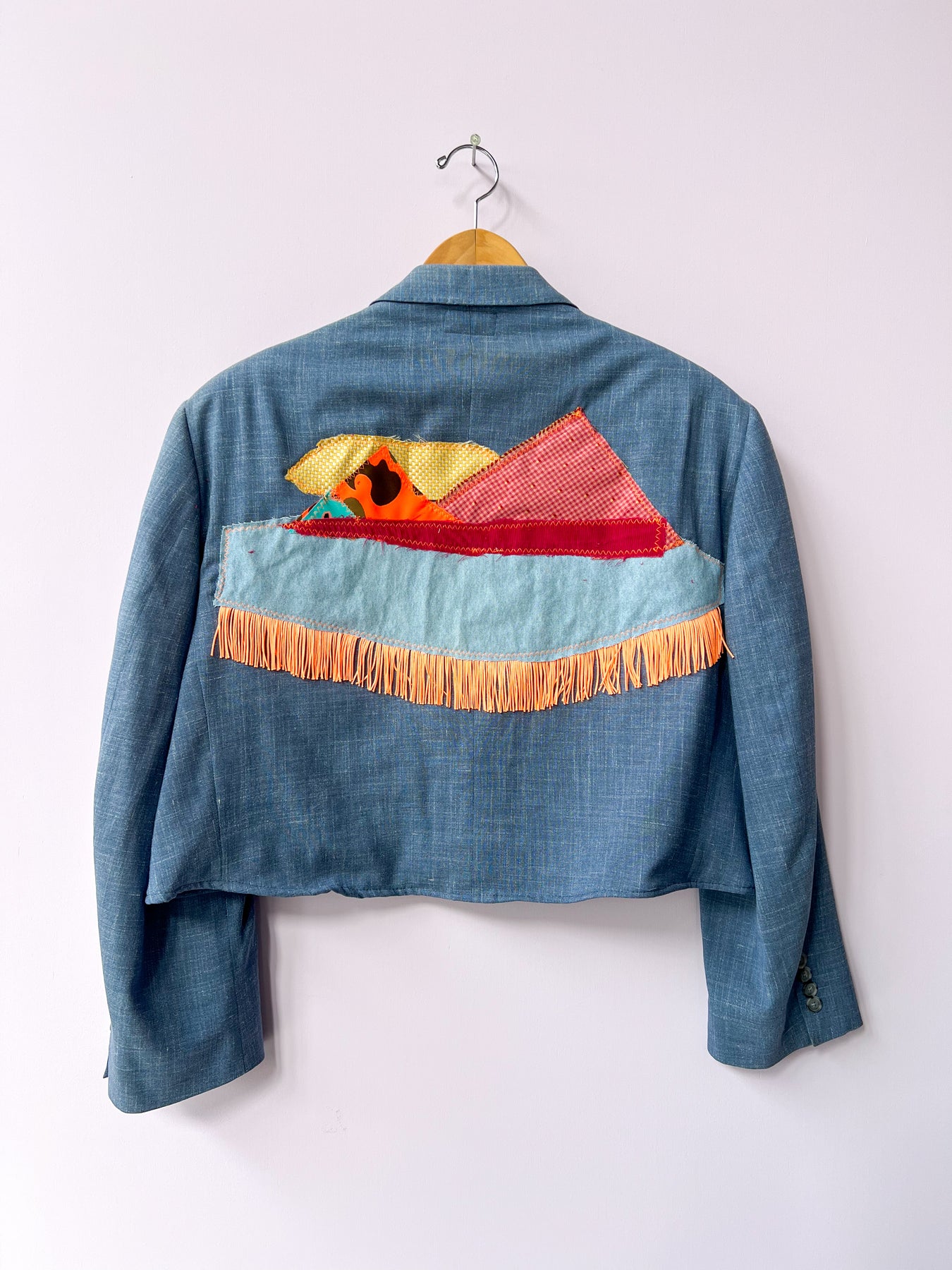 Upcycled from a blazer headed for the landfill and utilizes excess fabric from past projects. This is a true sustainable garment!