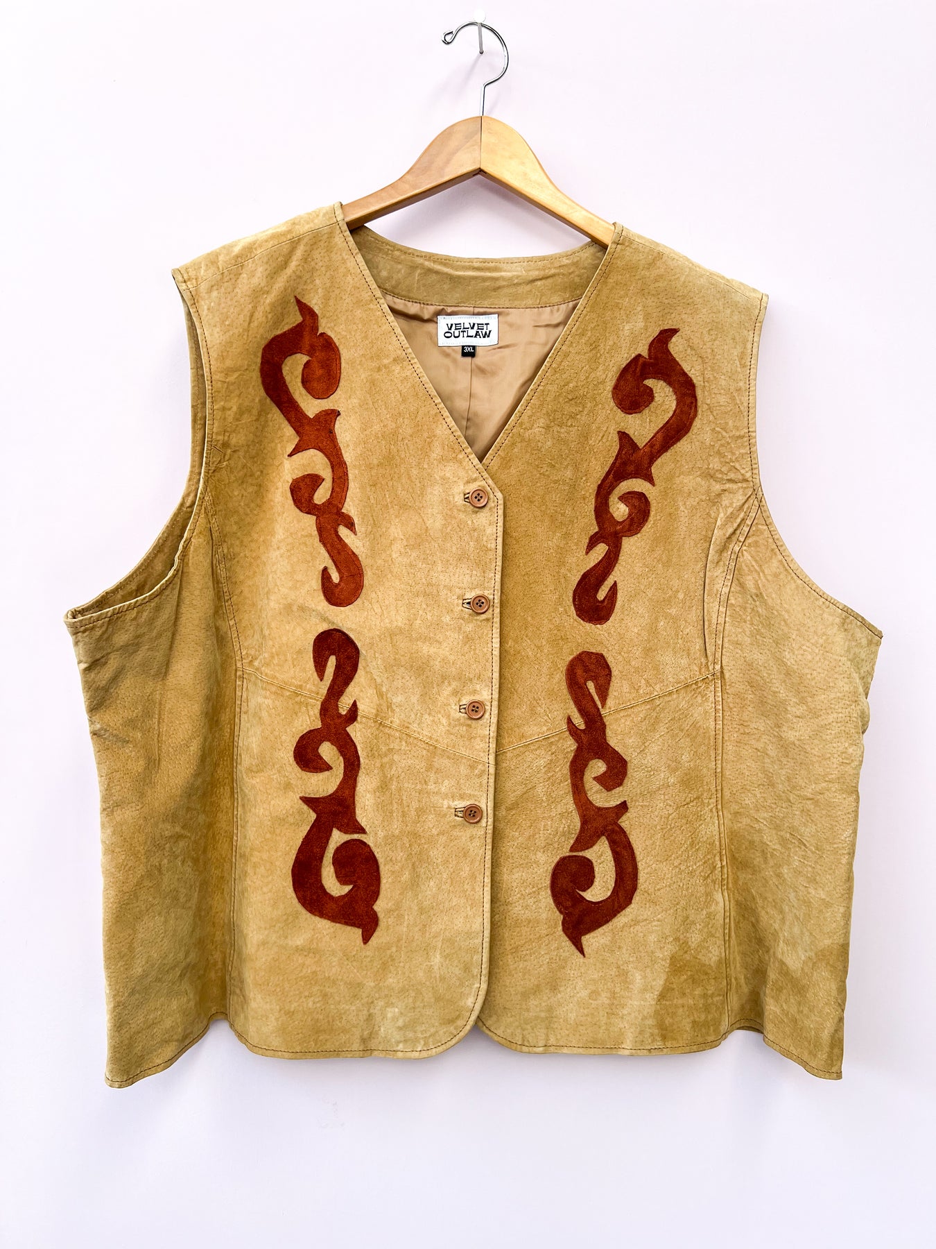 Real leather suede vest with hand cut leather suede applique stitched on the front.