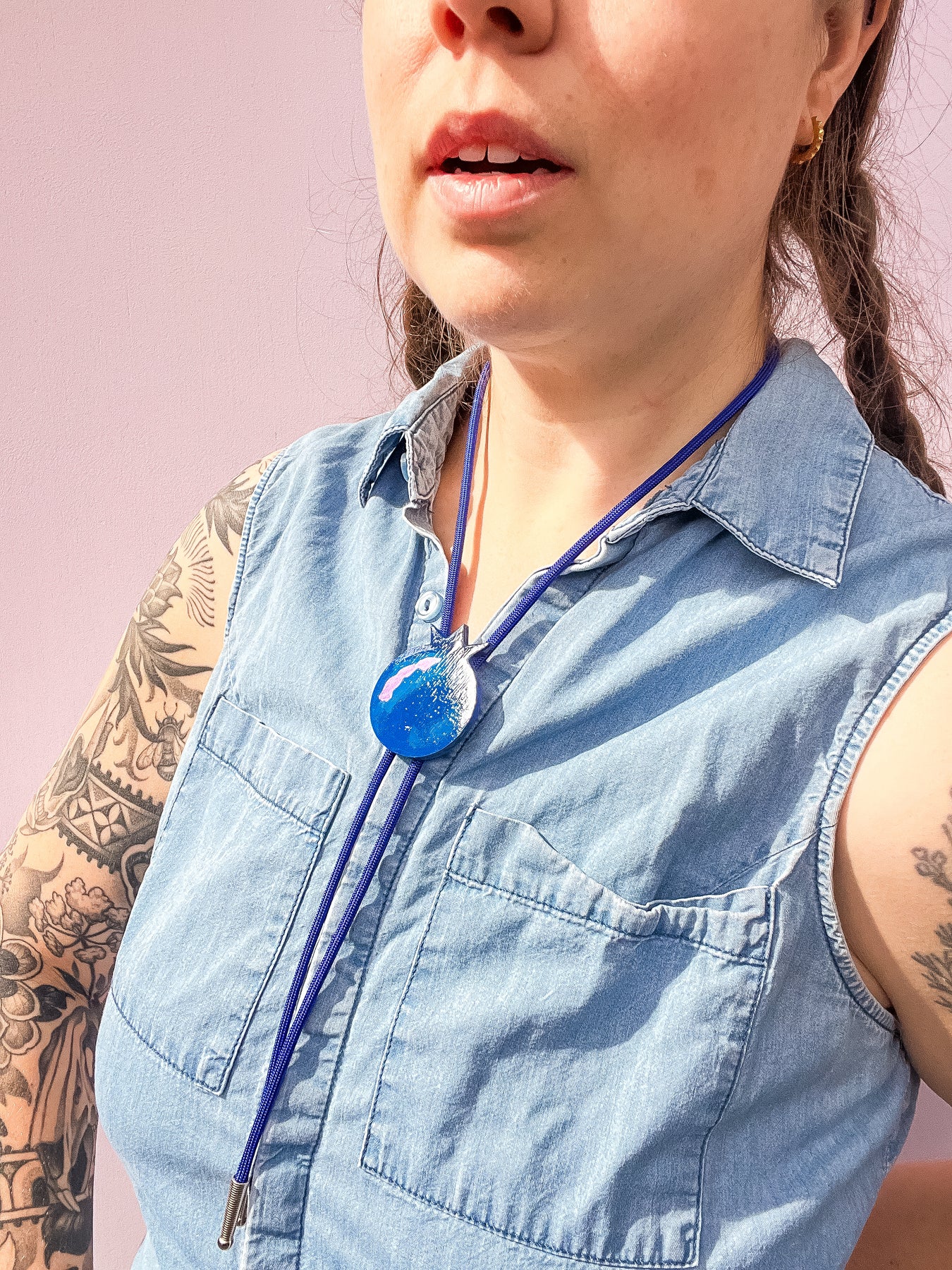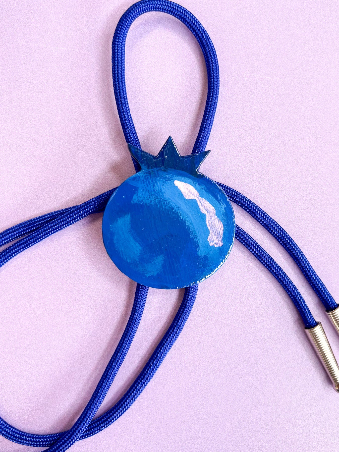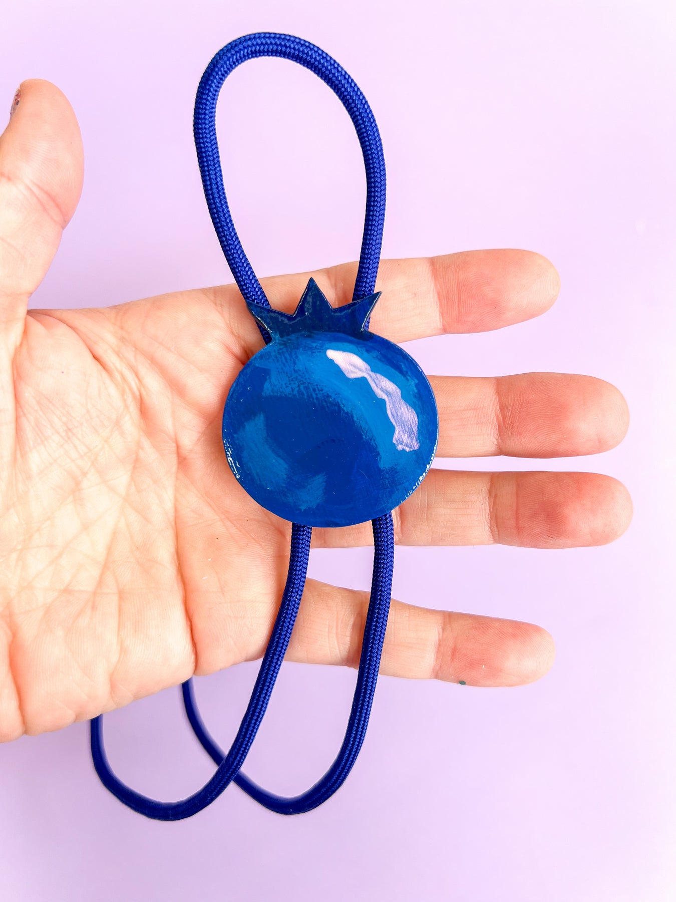 This bolo tie is hand-painted and set on a blue cord with shiny silver tips.