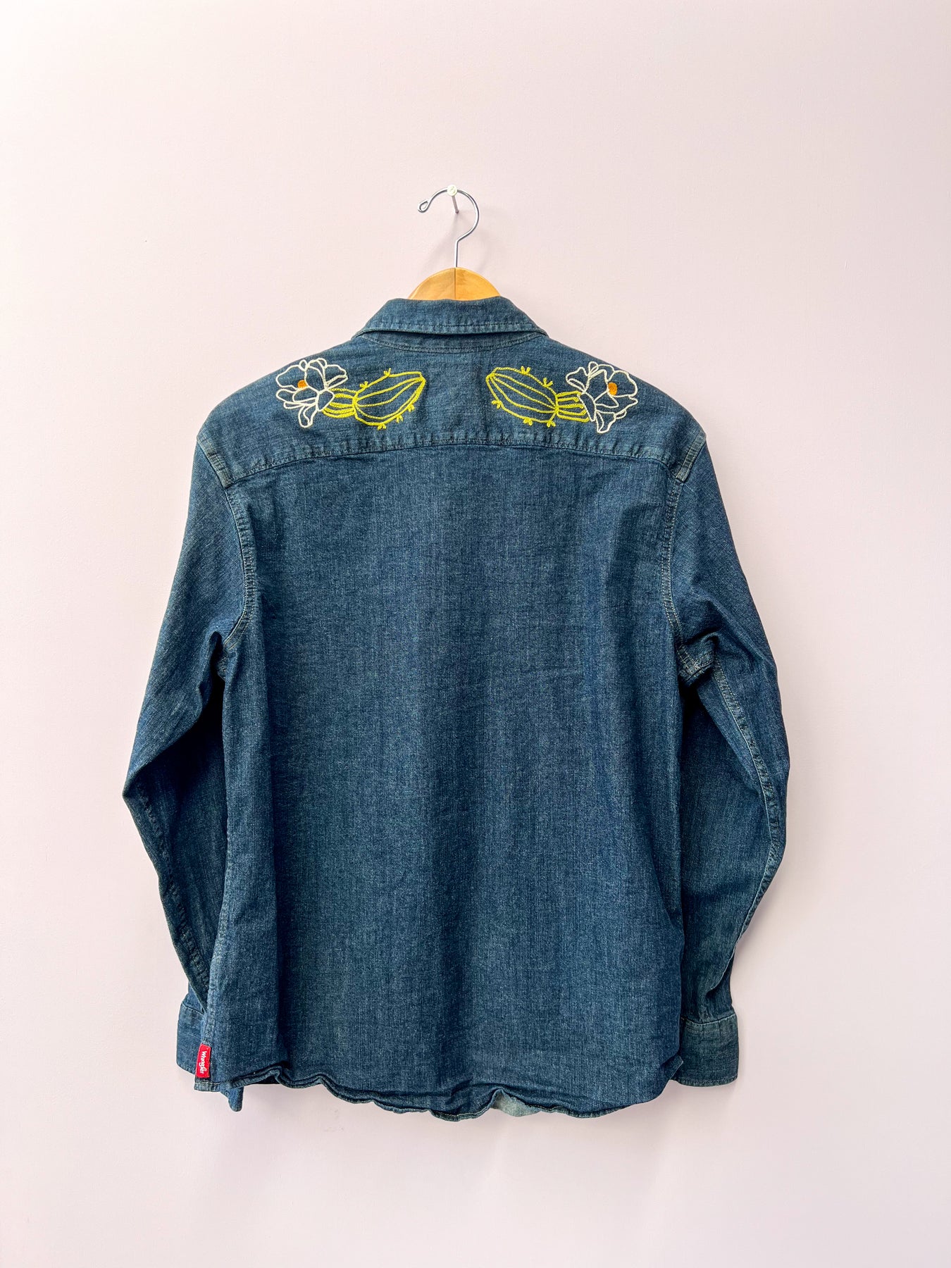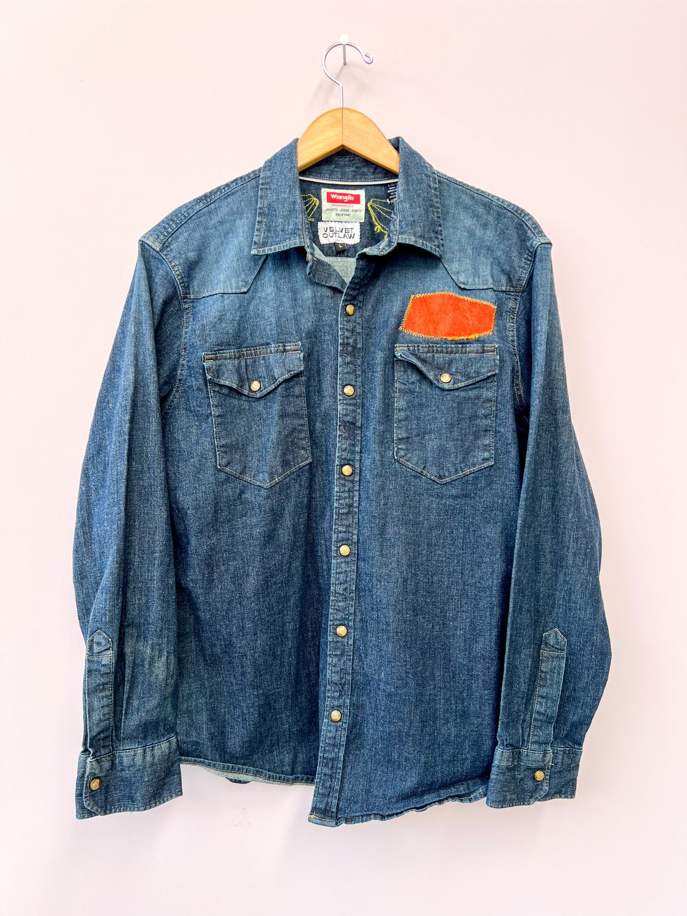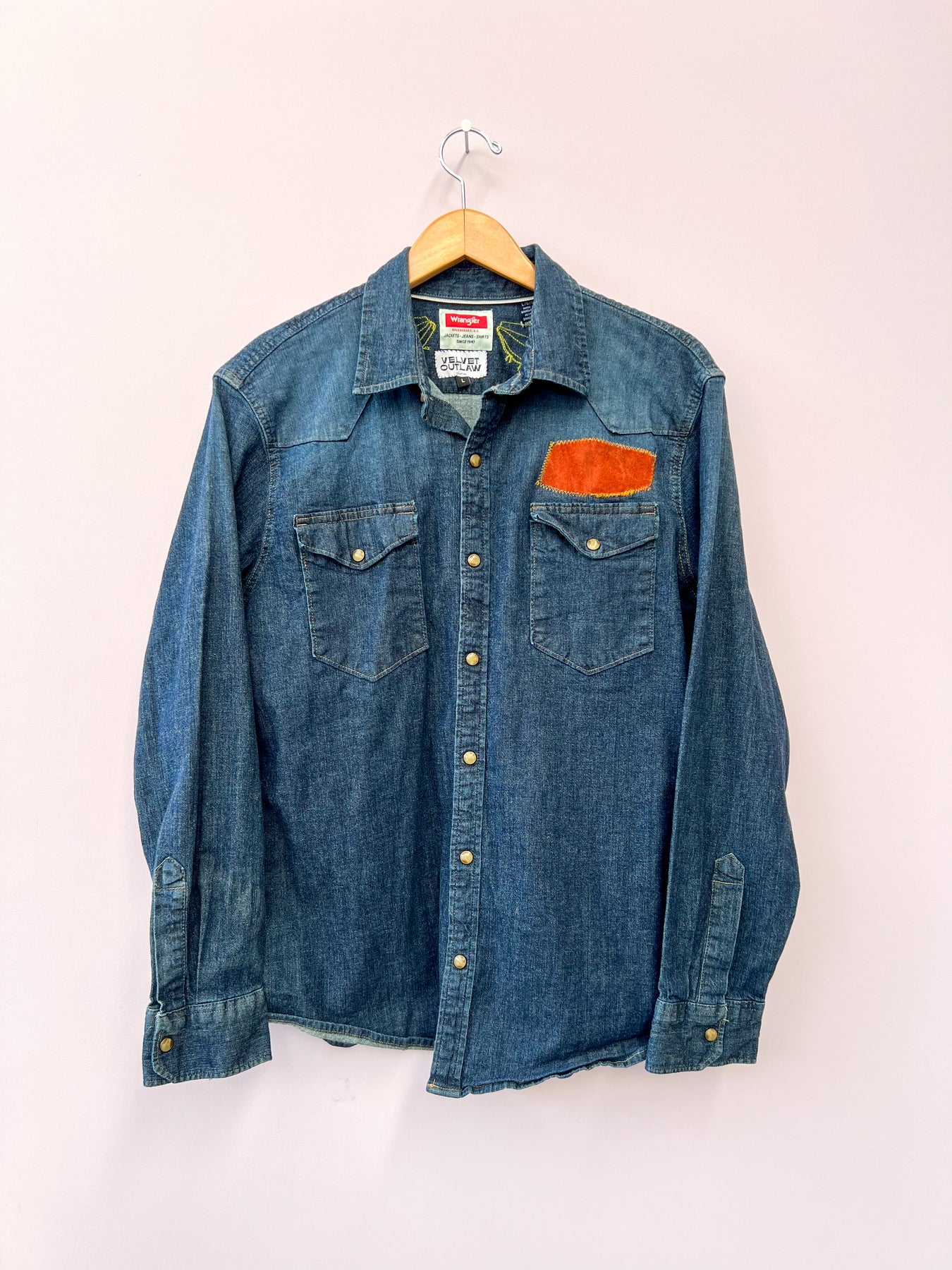 Wrangler rework with a suede patch above the right pocket and chain stitching detail on the back yoke.