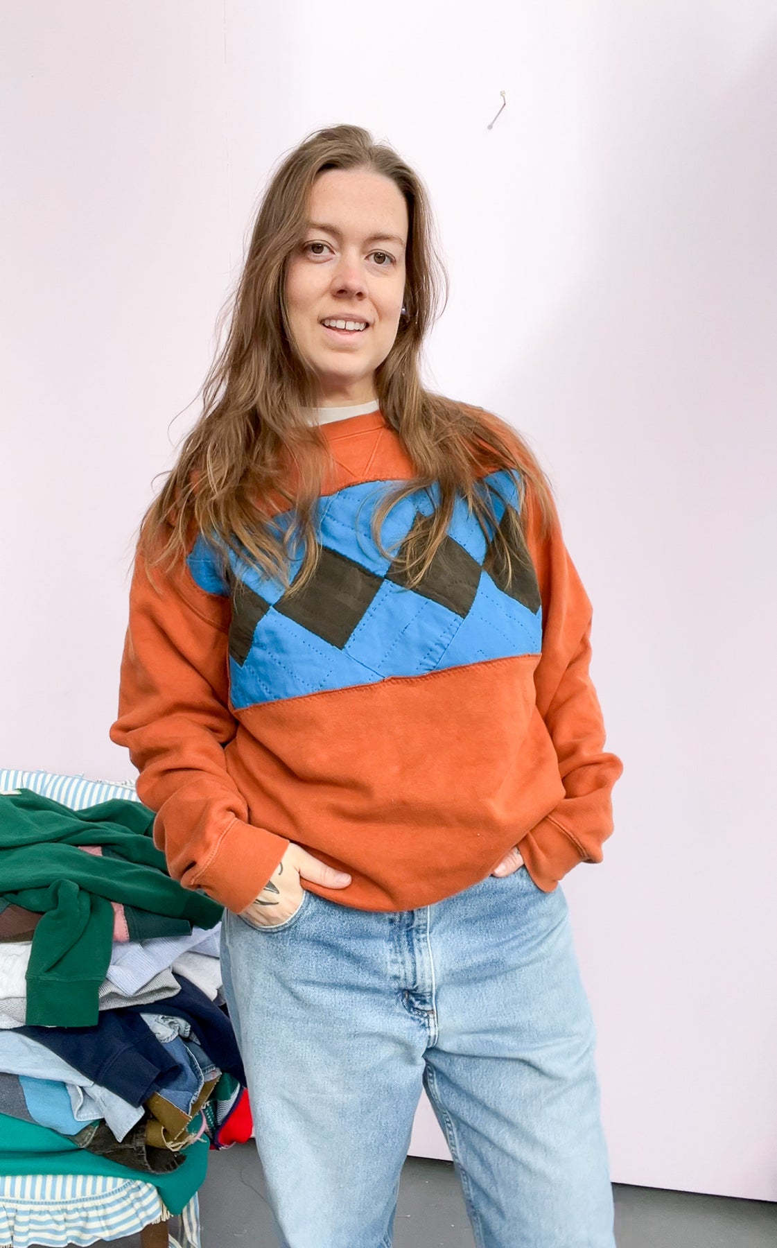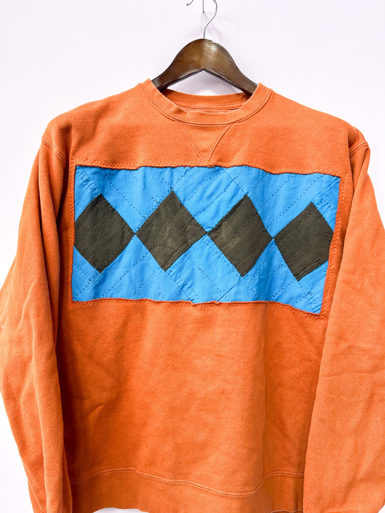 orange sweatshirt with a quilt panel stitched in the front - cozy & machine washable.