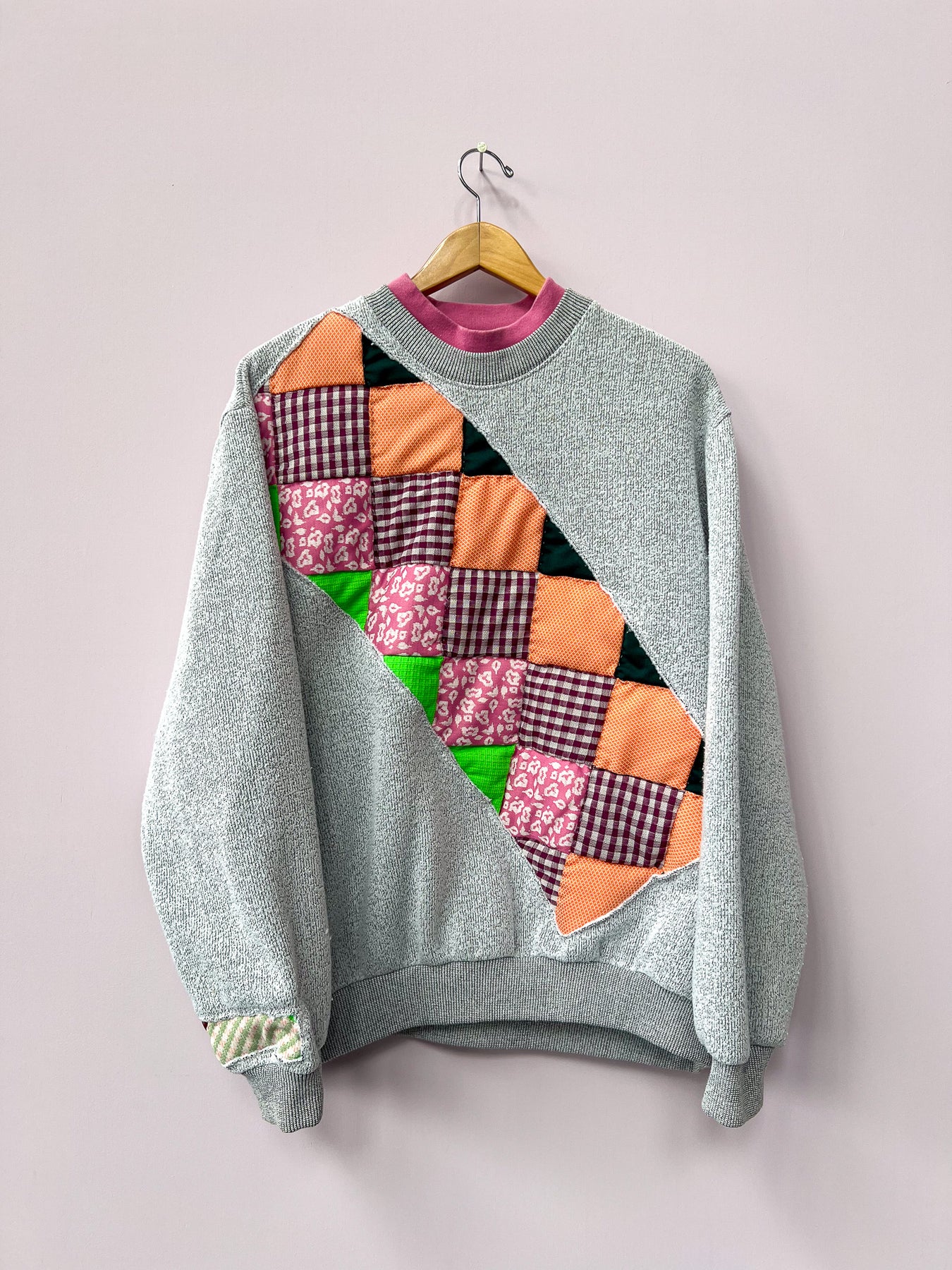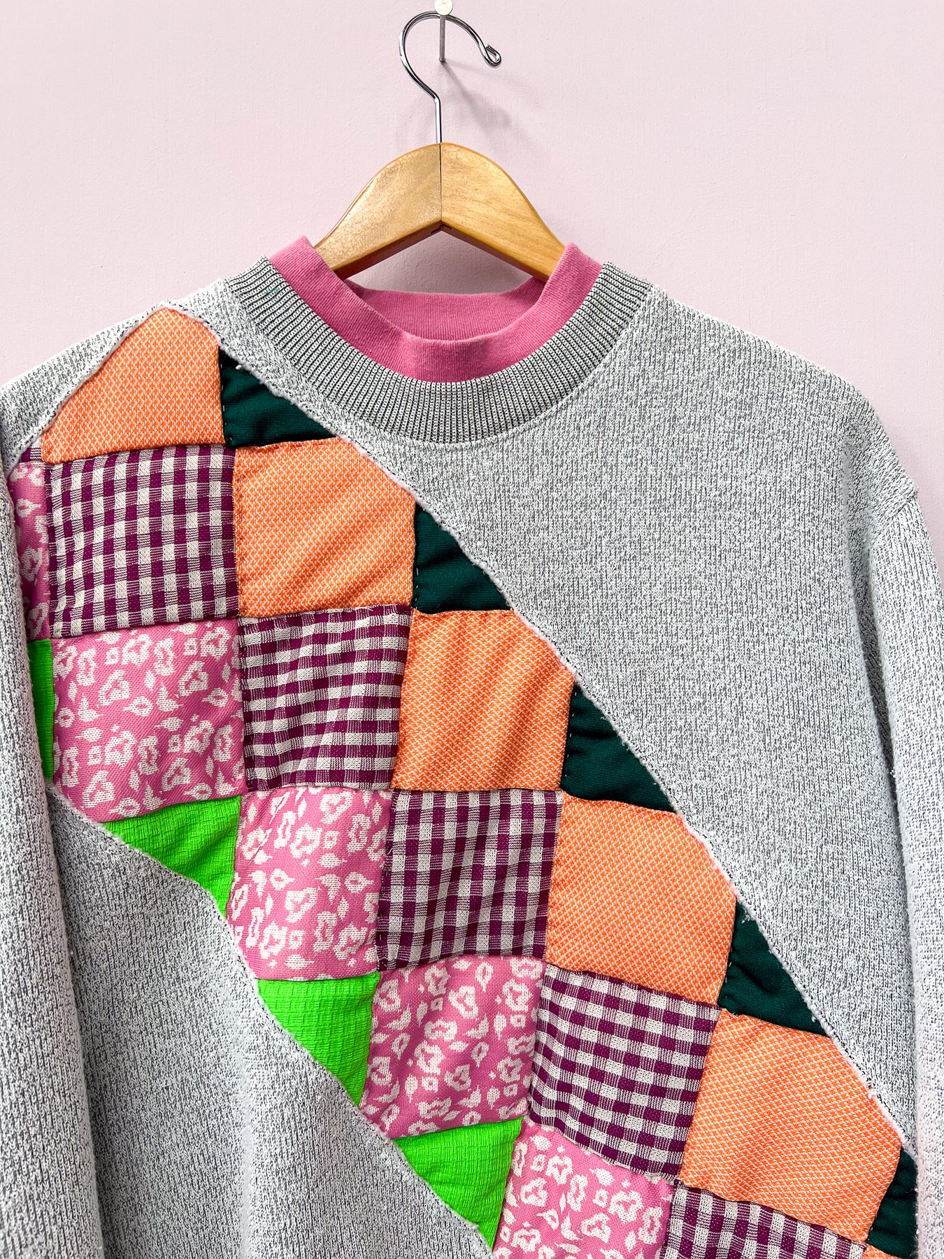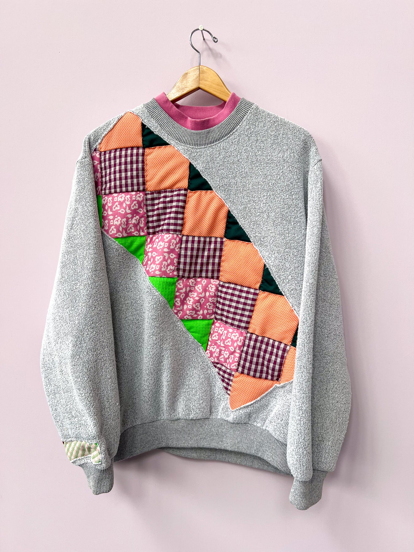 Grey sweatshirt with a quilt panel stitched in the front - cozy & machine washable.