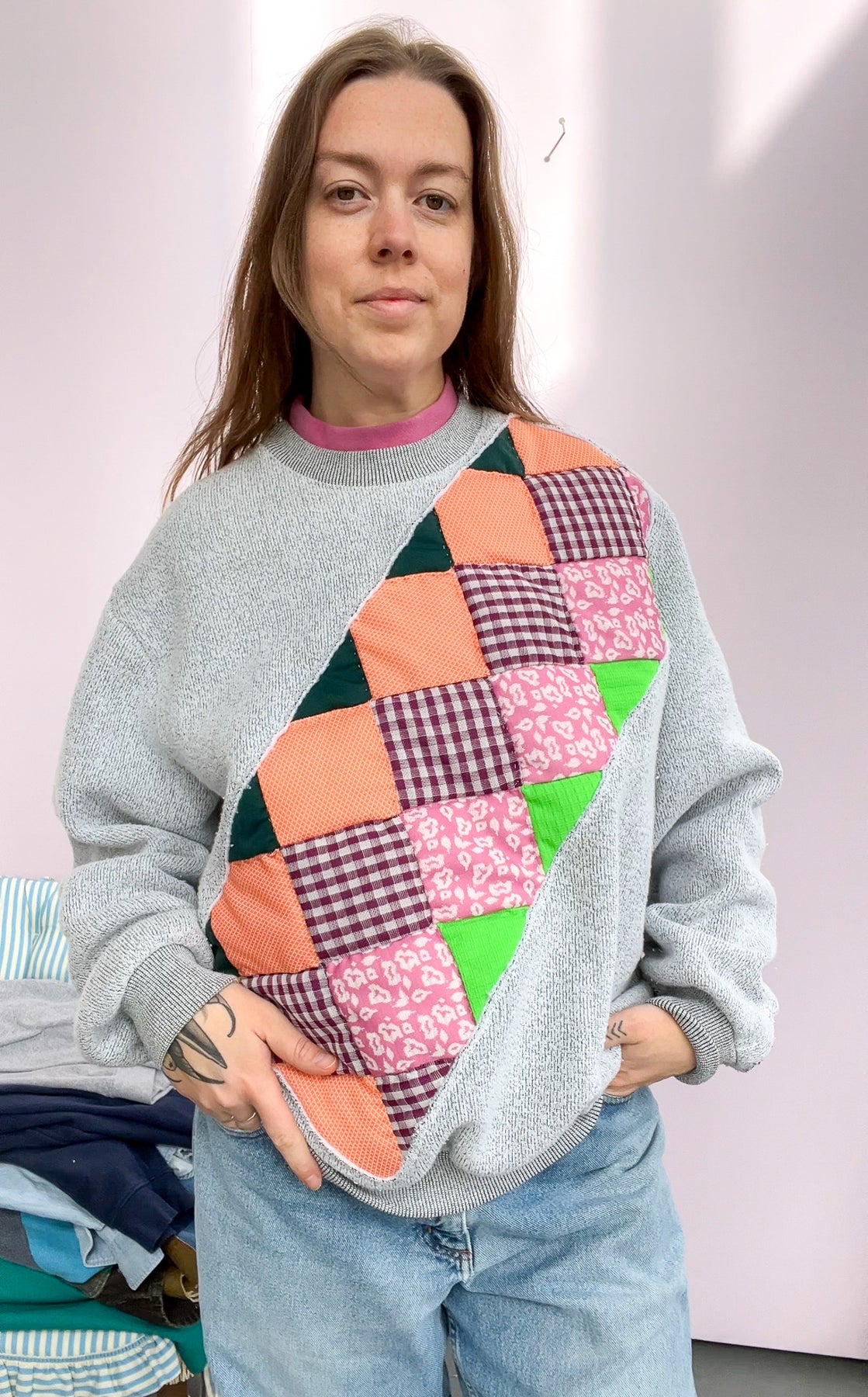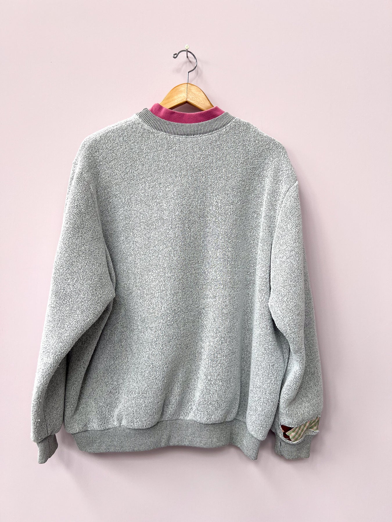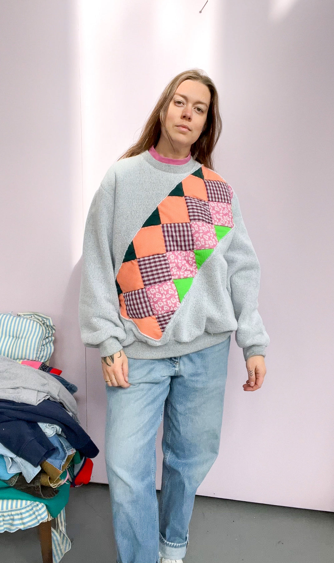 Grey sweatshirt with a quilt panel stitched in the front - cozy & machine washable.
