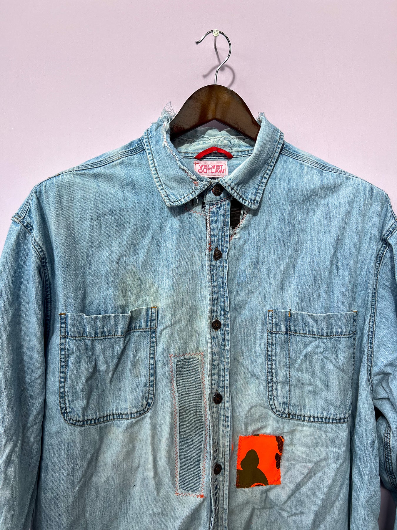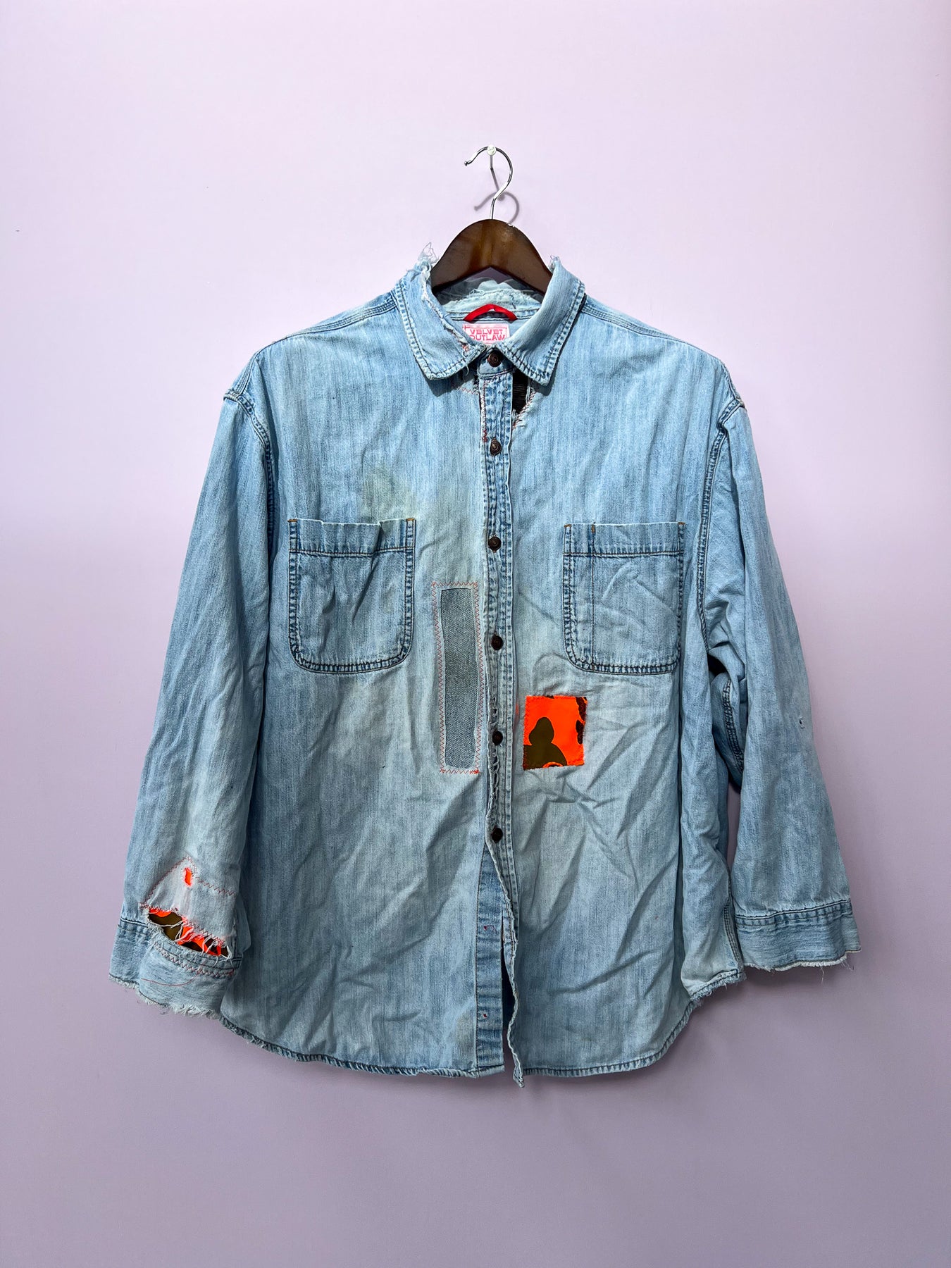 very well worn denim shirt with a lot of repair patches using orange hunting camo fabrics. Shirt is extremely worn with stains, rips, fraying, and patches. This is a shirt for someone who appreciates a well lived in shirt. Its so soft!